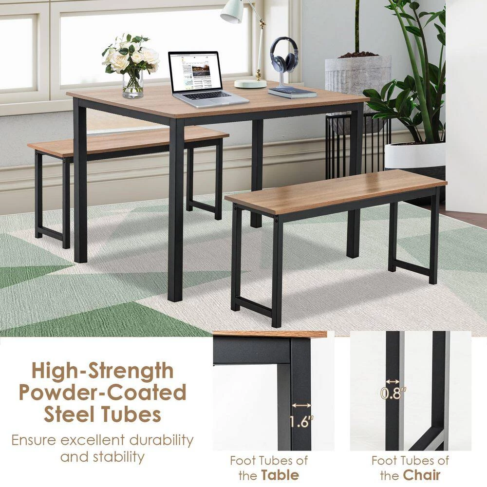 Are you looking for a dining room table and chair set, but are worried that the dining room will look crowded. This 3-piece dining table set will relieve you of such worries. With a reasonable size, the benches can be pushed under the table after meal and the long bench can accommodate at least 4-people, making it an ideal choice for you to chat and enjoy delicacy with your family. Made of reinforced metal frame, the set has good stability and large load-bearing, while each bench can hold up to 330 lbs., and the table can hold up to 100 lbs. Besides, the smooth lines and classic rectangular shape, making it can be perfectly match with your decor style.