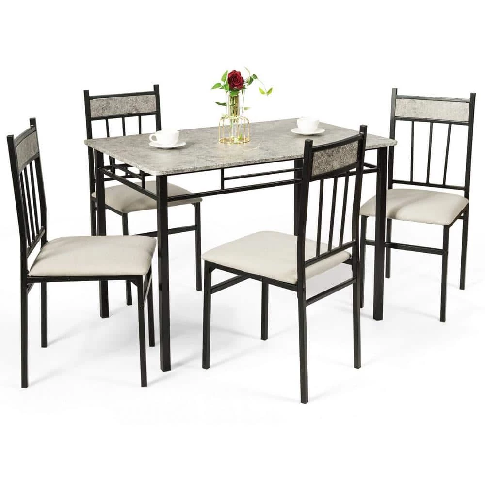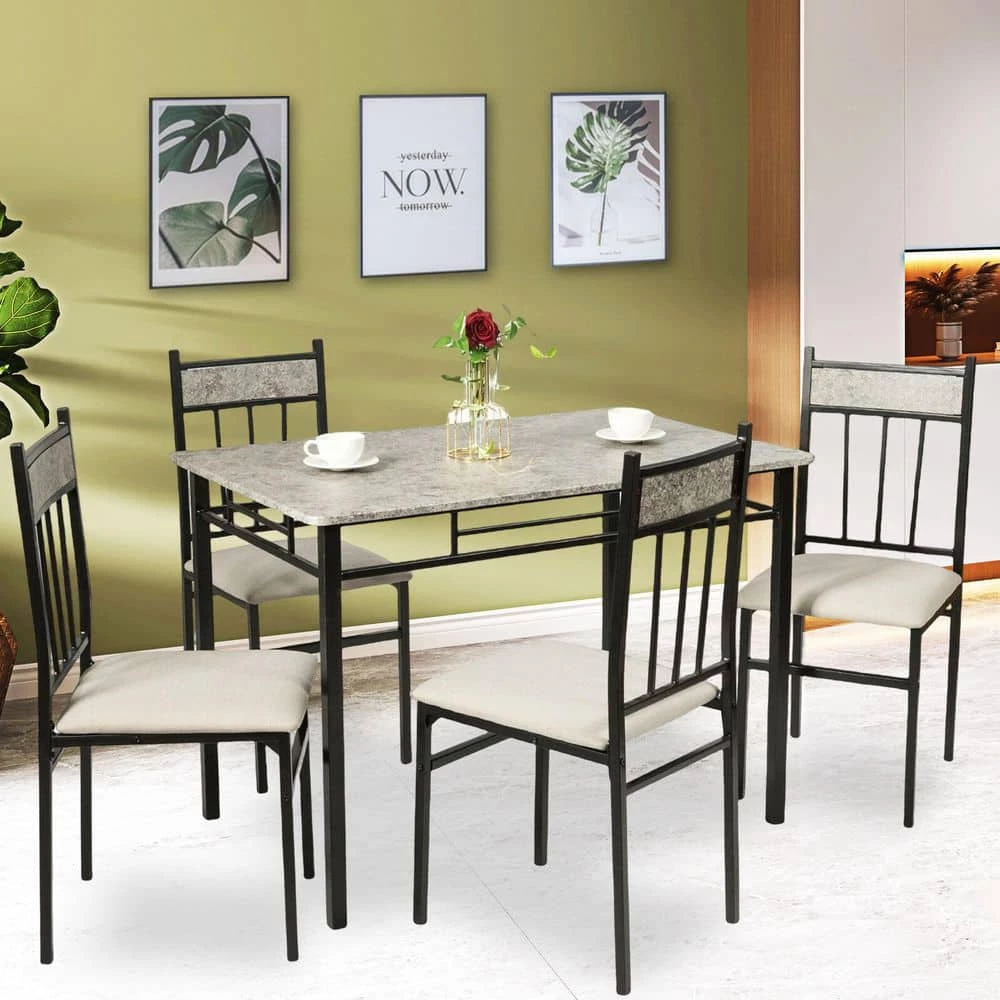 The dining table with chairs is supported by premium rustproof steel pipes to guarantee long-lasting usage of the set. Smooth marble textured tabletop made of high-quality MDF board not only facilitates cleaning but also adds a noble and generous atmosphere to the room. What’s more, the soft cushion filled by high-density sponge gives you a more comfortable sitting experience even at a long family dinner.