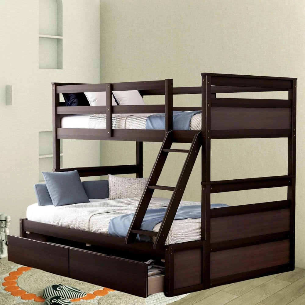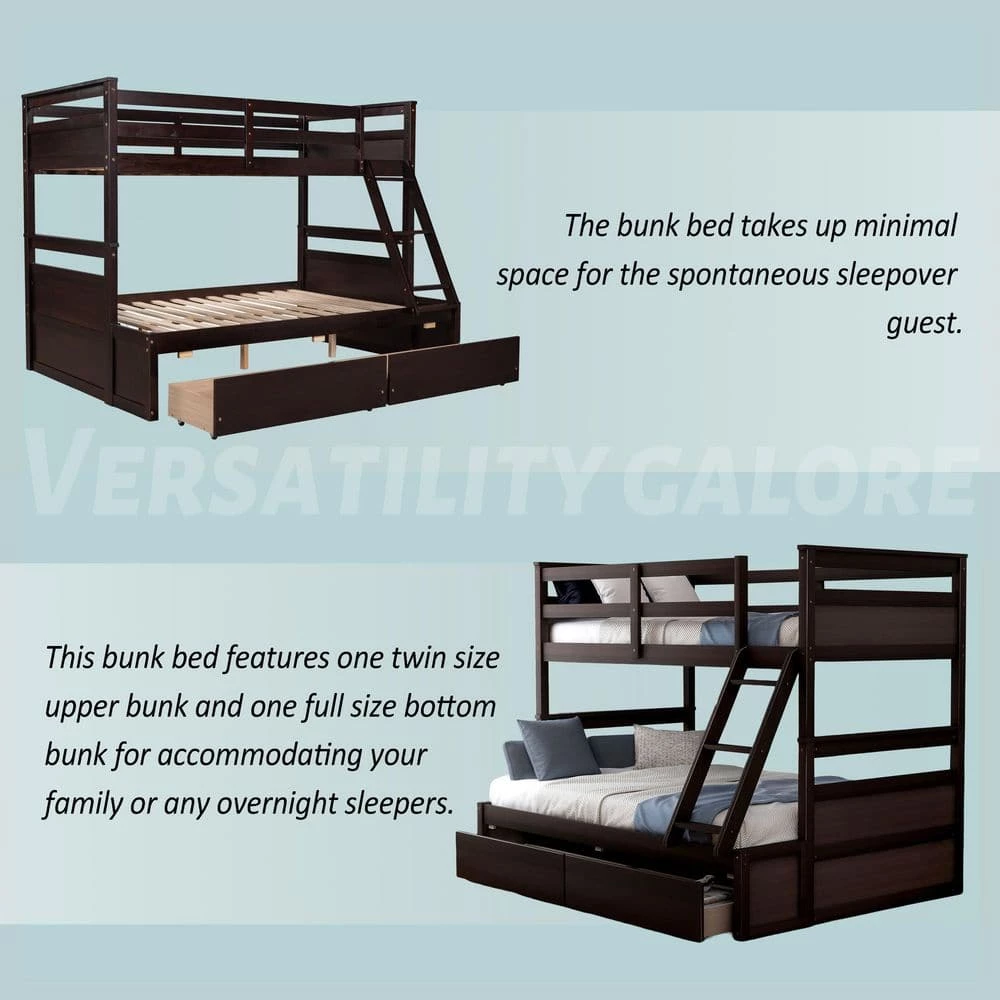 - Bunk bed features 1 twin size upper bunk and 1 full size bottom bunk for accommodating your family or any overnight sleepers