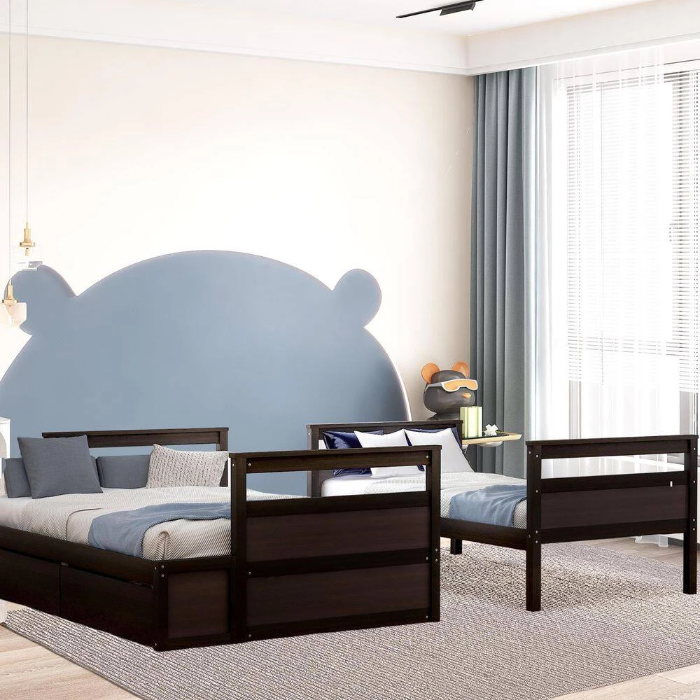If you need extra sleeping space or your family love sleepovers, this Twin-Over-Full Bunk Bed with Storage is perfect for your home. A pair of drawers under the bottom bed provide ample storage for your family’ toys and bedding. High-quality, solid pine legs and a strong, durable frame ensures stability and durability for long-term use and can be separated into 1 twin and 1 full-size bed. Slat kit included so box springs are not required. This bunk bed is designed with a clean silhouette and a hue of elegance. It suits all styles of home decoration and completes the look of any bedroom.