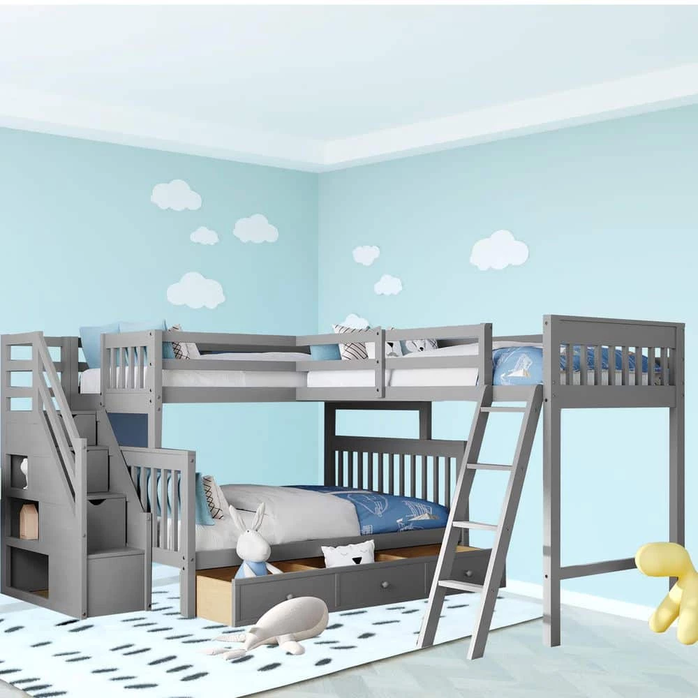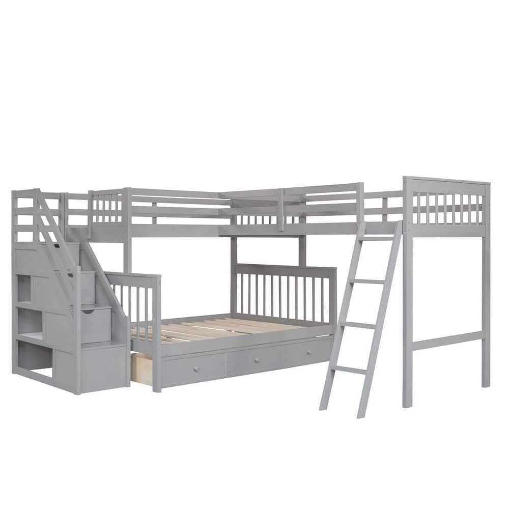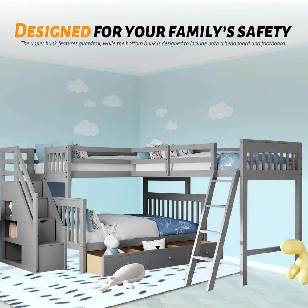 If you need extra sleeping space or your family love sleepovers, this L-Shaped Bunk Bed with 3-Drawers is perfect for your home. The drawers under the bottom bed and shelves in staircase provide ample storage for your family’s toys and bedding. High-quality, solid pine legs and a strong, durable frame ensures stability and durability for long-term use. Slat kit included so box springs are not required. This bunk bed is designed with a clean silhouette and a hue of elegance. It suits all styles of home decoration and completes the look of any bedroom.