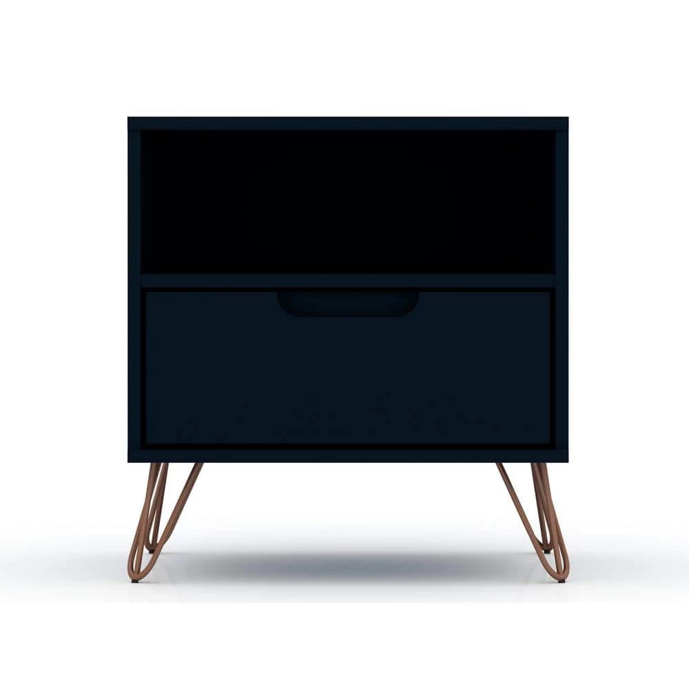 Moonlighting as an end table or armchair sidekick, the Intrepid nightstand is seamless and sophisticated, with plenty of Mid-century flair, enhanced by edgy metal splayed legs, cutout drawer handles, and clean lines, to feature one sophisticated design. Tuck away remotes, books, tablets, and more, in the concealed drawer space, and keep magazines, laptops, or books, in the open shelf space for easy access. Add a decorative lamp and favorite framed photos on its base and set it in the living room or bedroom to finish off the space.
