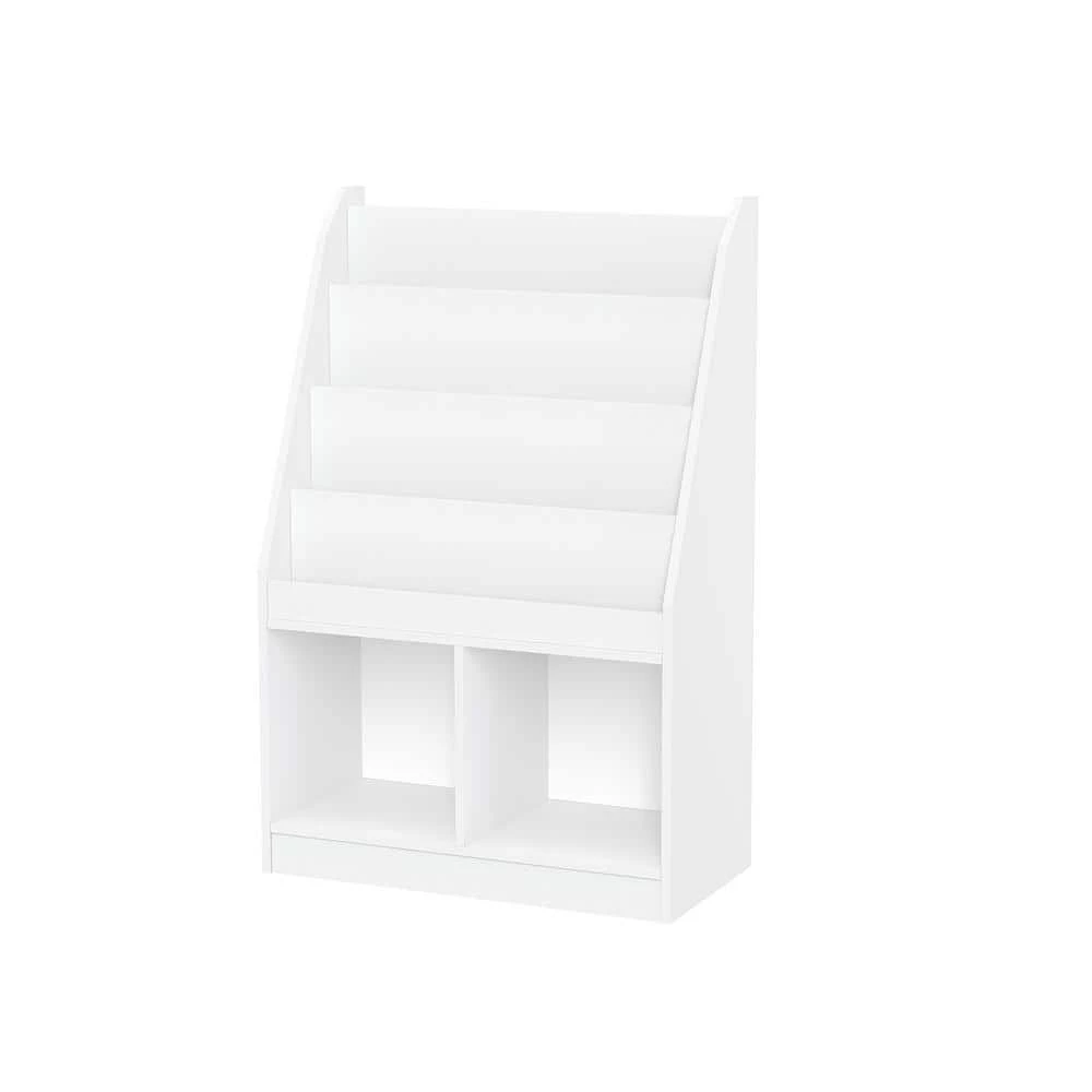 Create a fun and organized reading nook with this kids bookrack with two cubbies. With a smooth, white painted finish and clean lines, this storage unit is versatile enough to go in any room of the home. Four horizontal bookracks allow your child to easily access and display their favorite books while two square cubbies below are ideal for storing games, toys or even more books. Optional two fabric bins tuck away nicely to conceal clutter while adding a pop of fun color to your space. Standing at 36 in. High, this child-sized bookcase includes easy-to-adjust anchor brackets for added safety and security.