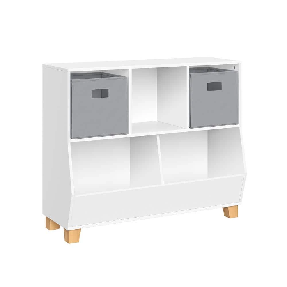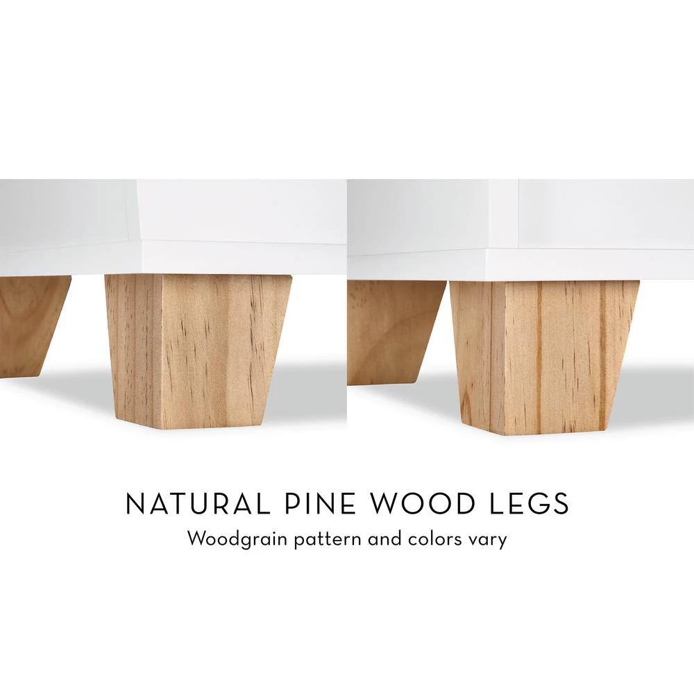 Create the perfect catch-all spot for all of the kids’ things with this multi-cubby organizer. Featuring 3 square cubbies and 2 spacious storage compartments, this modern toy organizer is the perfect organization solution for the playroom. with a white painted finish and 5 solid pine wood legs, its contemporary, yet versatile design adds functional style to any room. Fill the cubbies with books and puzzles and load up the bottom compartments with additional toys and games. Optional, 2 folding fabric storage bins tuck away nicely to conceal clutter while adding a pop of fun color to your space. Secure to the wall with the included, easy-to-adjust anchor brackets for added safety and stability.