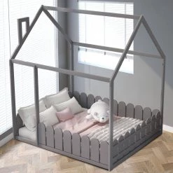 Gray Full Size Wood Bed House Bed Frame with Fence by SUNRINX