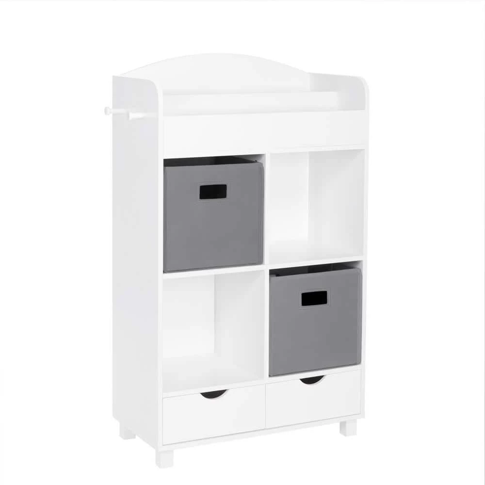 The RiverRidge Book Nook Collection Kids Cubby Storage Cabinet with Bookrack versatile cubby cabinet features ample storage with four cubbies, two-slot bookrack, two drawers and two hooks. Available with or without gray, turquoise or red Two-Piece Folding Storage Bins. Additional dimensions are: Cubbies: 11 in. W x 11.13 in. D x 11H, Top Shelves: 22.5 in. W x 5.06D, Inside Drawers: 9.06 in. W x 9.31 in. D x 2.88H, Side Hooks: 1.88D, Bin: 10.5 in. L x 10.5 in. in. D x 10 in. H.