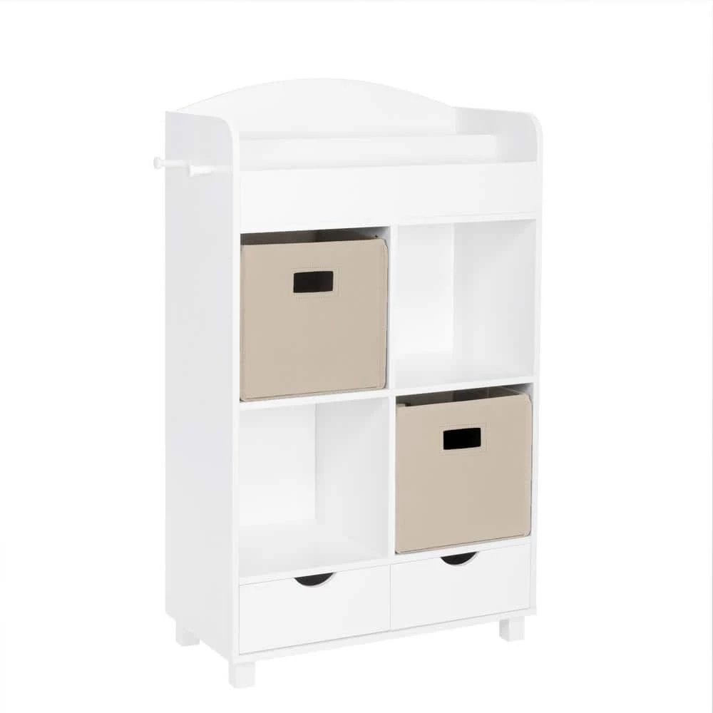 The RiverRidge Book Nook Collection Kids Cubby Storage Cabinet with Bookrack versatile cubby cabinet features ample storage with four cubbies, two-slot bookrack, two drawers and two hooks. Additional dimensions are: Cubbies: 11 in. W x 11.13 in. D x 11 in. H, Top Shelves: 22.5 in. W x 5.06 in. D , Inside Drawers: 9.06 in. W x 9.31 in. D x 2.88 in. H, Side Hooks: 1.88 in. D , Bin: 10.5 in. L x 10.5 in. D x 10 in. H.