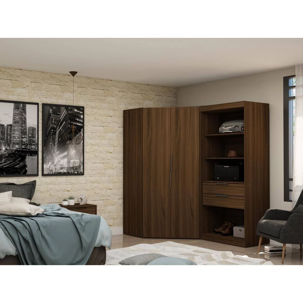 Upgrade your closet and give your space a makeover with the 2-Piece Ramsey corner wardrobe, a piece that offers extra room for tucking away your things and looks even better while doing it. With rounded hanging rods and open shelving, clean lines, and understated design, this piece goes well with any existing decor and is the perfect wardrobe solution for all your extra things. Set it in a corner of the bedroom where it blends seamlessly into your master suite and youll never lose sight of your favorite pieces. The side Ramsey wardrobe is shelving done right with open space for keeping your favorite clothing items organized and easily accessible. A pair of drawers tuck away personal items and a larger upper shelf is perfect for displaying accessories, hand luggage, or hats. The solution for extra space has arrived and its seamless design blends well with any existing decor to keep your room looking as good as it is functional. Great in a smaller or larger space for acting as a shelving and closet unit without overtaking a space. Option to pair with additional wardrobe modules to maximize your space and storage/wardrobe needs.