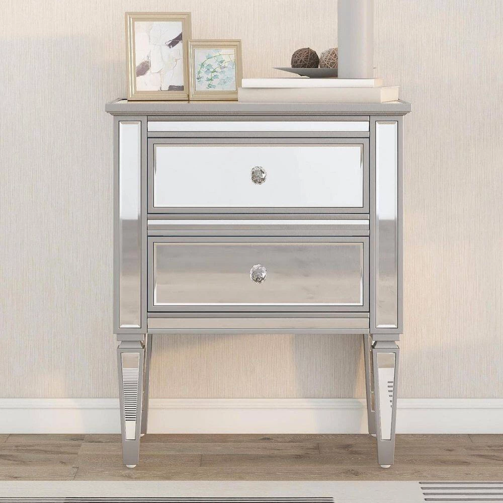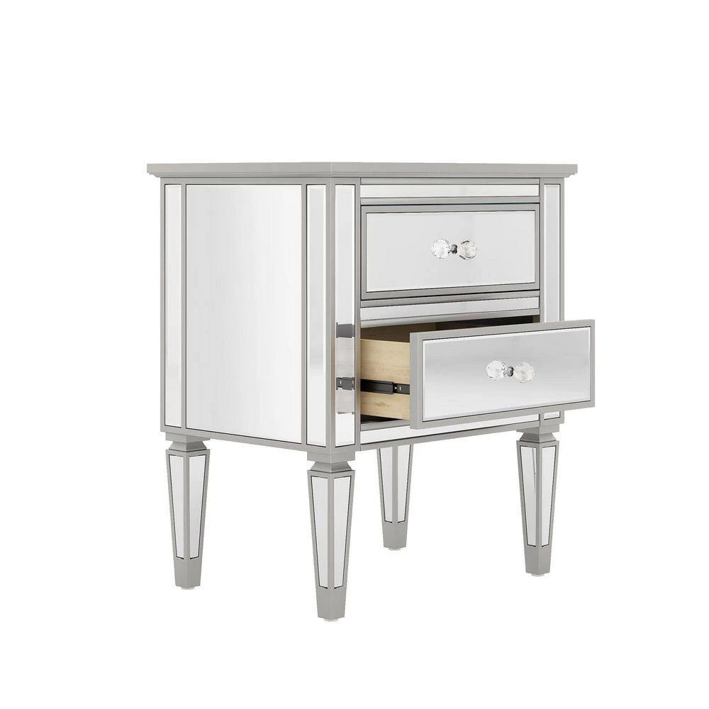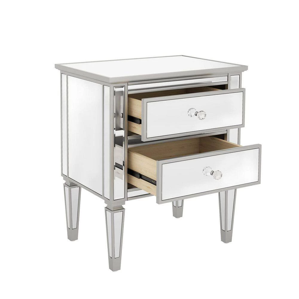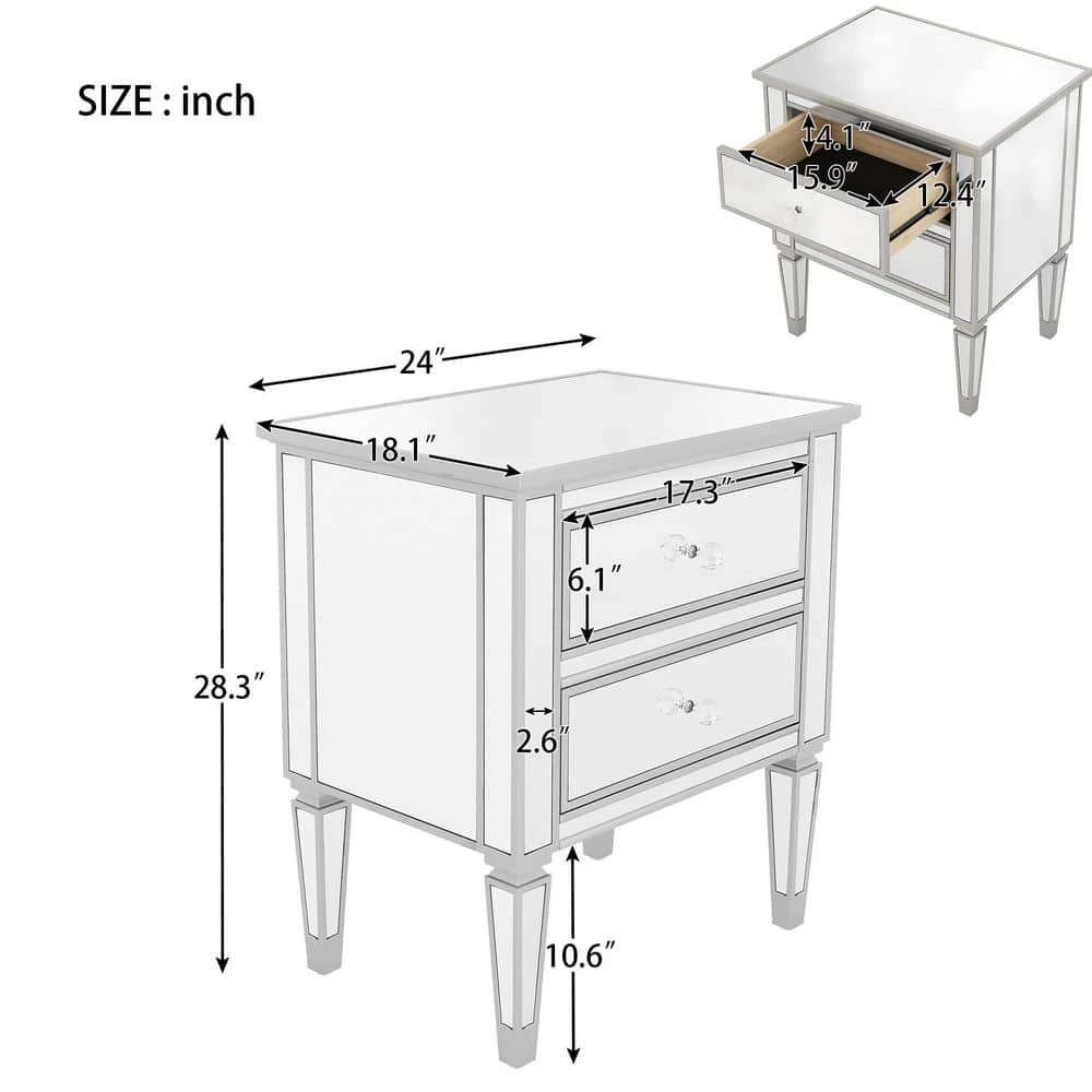 Make a striking statement with this gleaming mirrored 2-drawer horizontal nightstand and live in the elegantly sleek future. Its contemporary style is defined by the alternating panels of polished beveled mirror panels. Its alternating panels that wrap around the entire cabinet creates an amusing design that everyone will enjoy and marvel at.