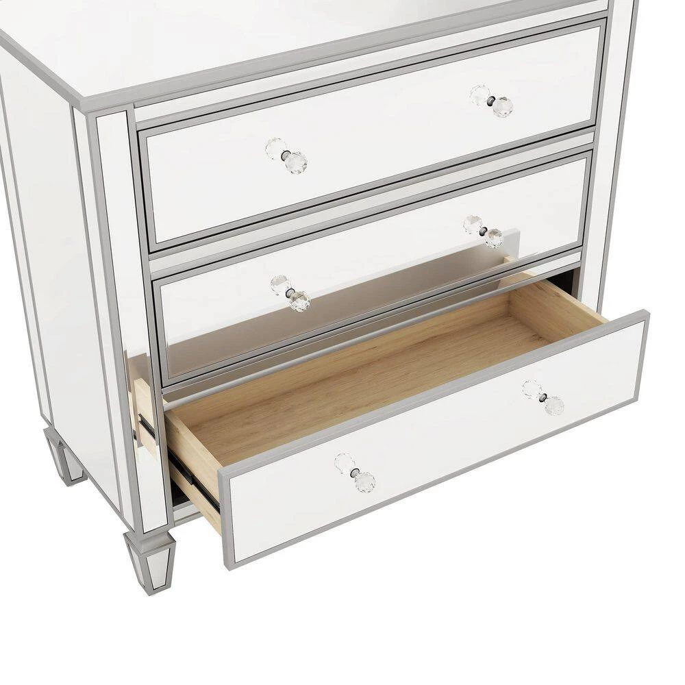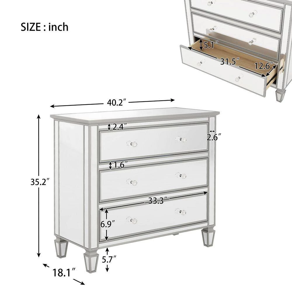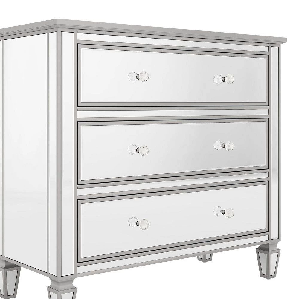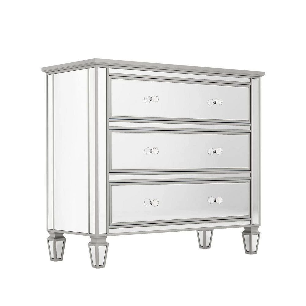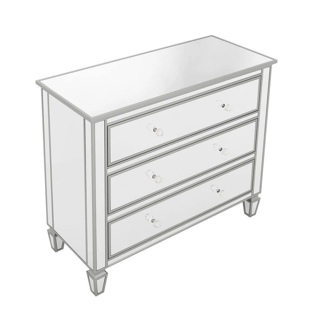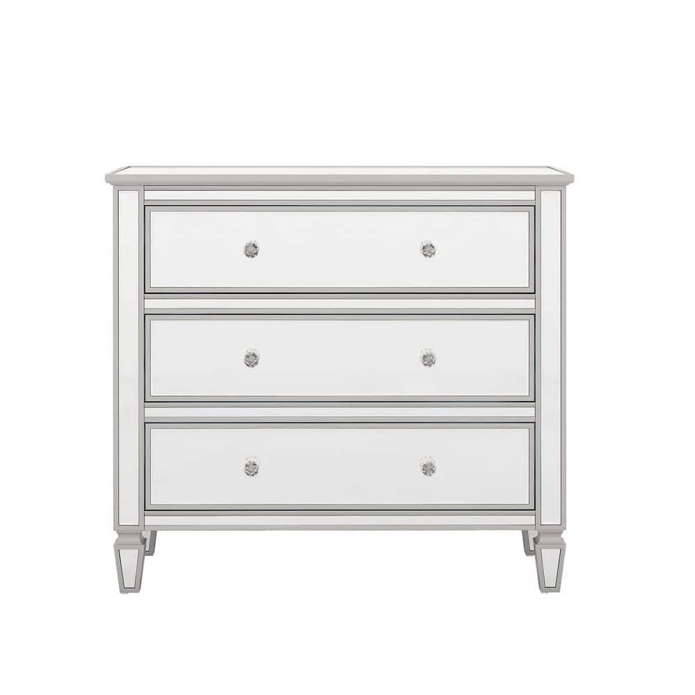 Make a striking statement with this gleaming mirrored 3-drawer horizontal chest and live in the elegantly sleek future. Its contemporary style is defined by the alternating panels of polished beveled mirror panels. Its alternating panels that wrap around the entire cabinet creates an amusing design that everyone will enjoy and marvel at.