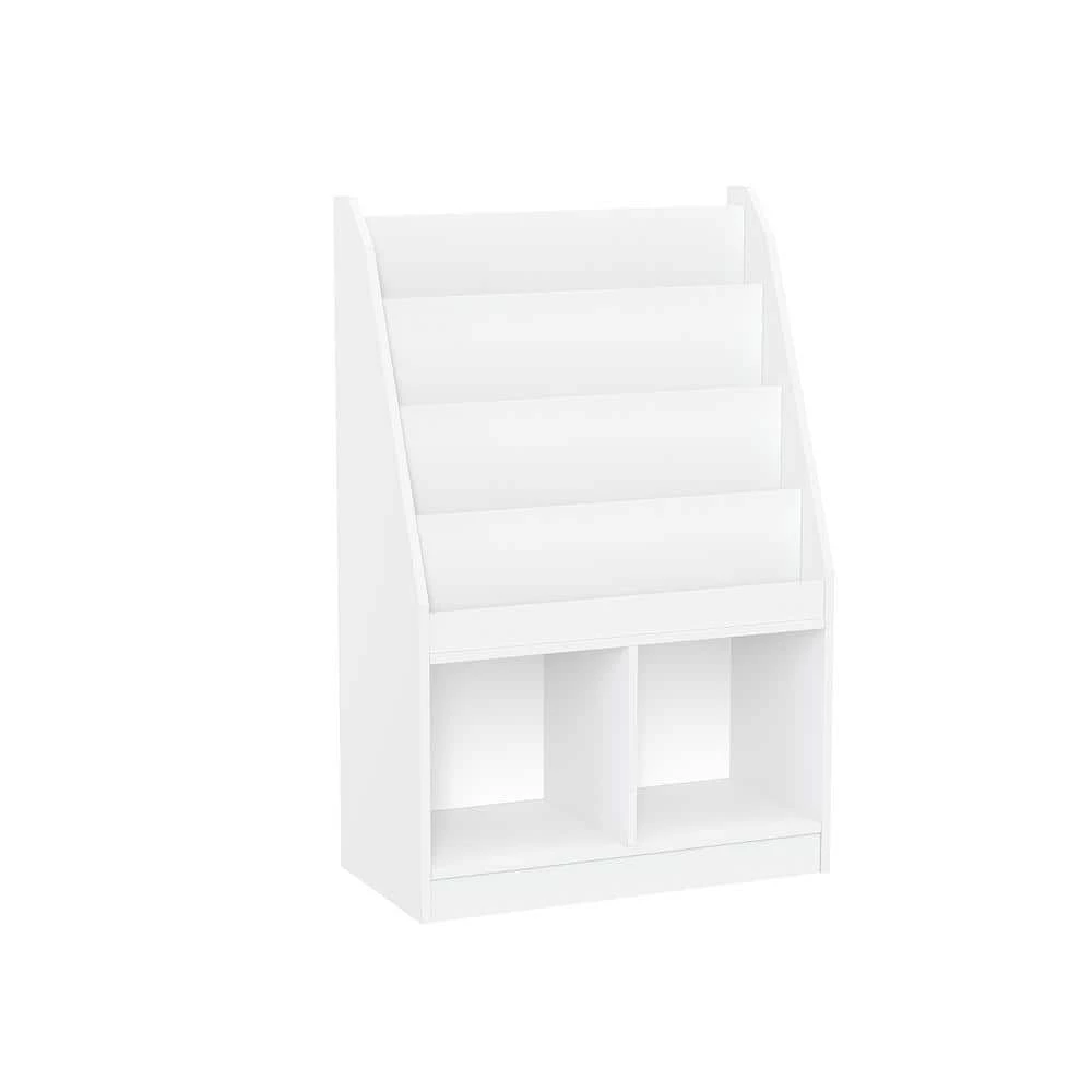 Create a fun and organized reading nook with this kids bookrack with 2-cubbies. With a smooth, white painted finish and clean lines, this storage unit is versatile enough to go in any room of the home. 4-horizontal bookracks allow your child to easily access and display their favorite books while 2-square cubbies below are ideal for storing games, toys or even more books. Pair with a two-pack of folding fabric storage bins in your color choice to add hidden storage in the bottom cubbies while adding a pop of color to your space (bins sold separately). Standing at 36 in. H, this child-sized bookcase includes easy-to-adjust anchor brackets for added safety and security.